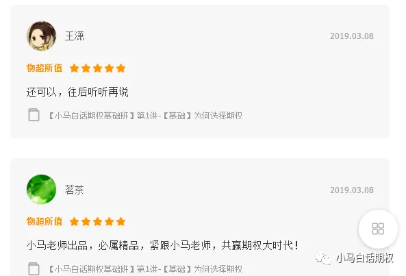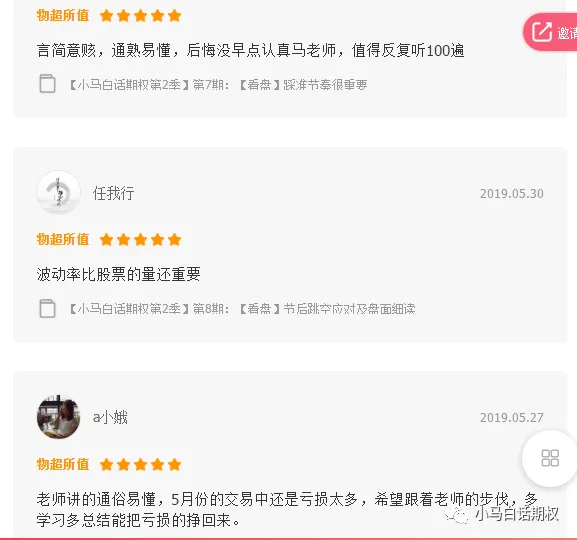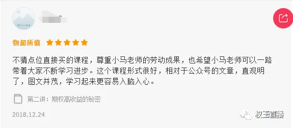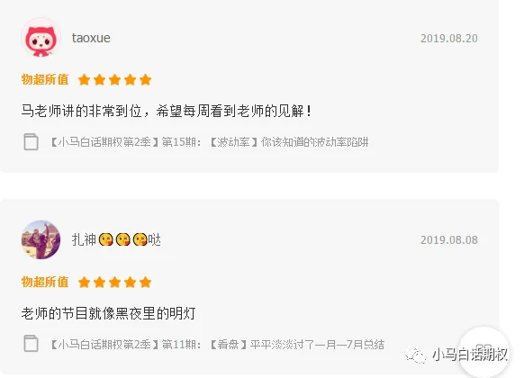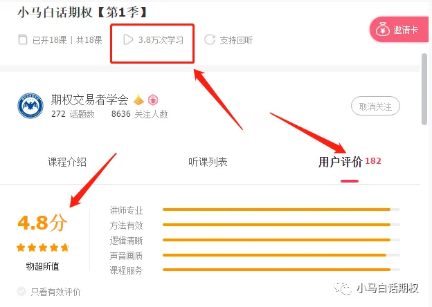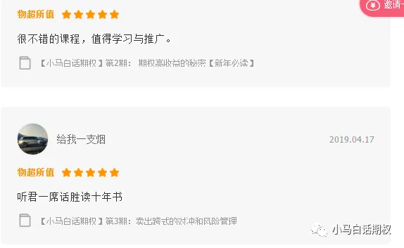 视频课程是为了满足不同学习习惯的读者,有人喜欢看书,有人喜欢群聊,有人喜欢看电子书,有人喜欢看视频。在公众号、雪球、微博、群等媒体照样知无不言言无不尽,不会私藏。当然,如果想一下子全包所有视频,可以加入小马奔腾VIP会员,上述视频免费看。当然,再结合《三小时快学期权》、《2周攻克期权策略》《小马白话期权2——多品种交易机会和稳健盈利策略》《小马白话期权》视频版基础班、第一季、第二季、第三季、第四季均已完成,我们看看评价与阅读量: