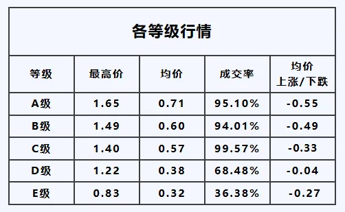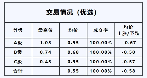 A级——最高价1.65元/枝,均价较昨日,下跌0.55元/枝;
