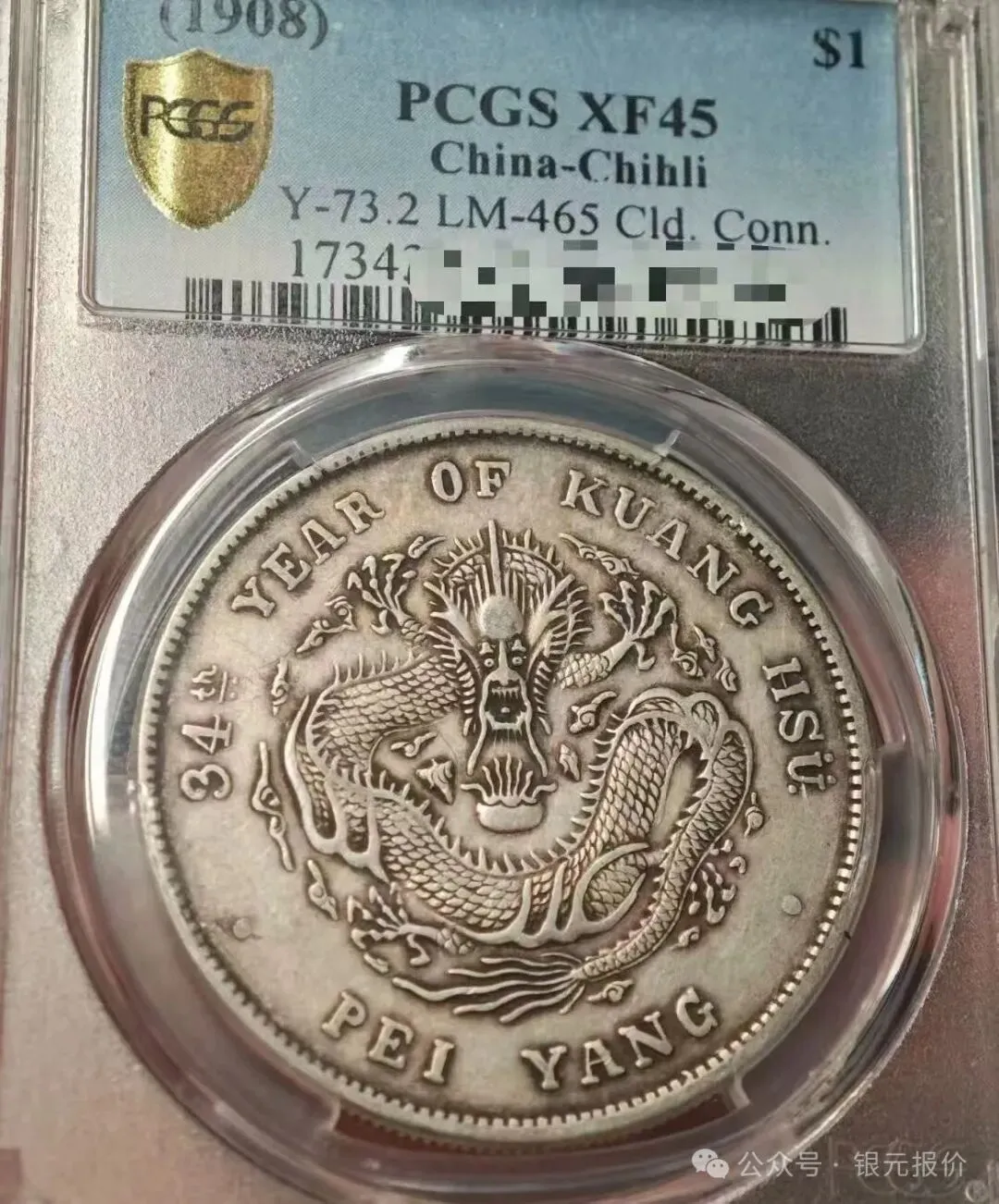 这三款银元在整个银元收藏中,属于价值相对不错的,尤其造总,价值遥遥领先。喜爱老银元收藏的爱好者,在龙洋品种中造总、大清宣三和北洋34年这三种银元似乎是标配,泉友们戏称“龙洋三剑客”。主要是这三种带龙图案的银元属于晚清中央政府铸造发行的,俗称“中央版”,有别于各省地方铸造发行的龙洋(比如江南龙、广东龙、湖北龙等等)。自2019年老银元市场行情升温至今,评级有分的龙洋三剑客行情一直开挂上涨中,直到2022年银元市场价格的整合,老银元开始了回调,2023年新的年国家开放,疫情结束,直到2025年开春老银元有了新的上涨!北洋,34年七钱二分普通 PCGS AU45 成交在10000元左右