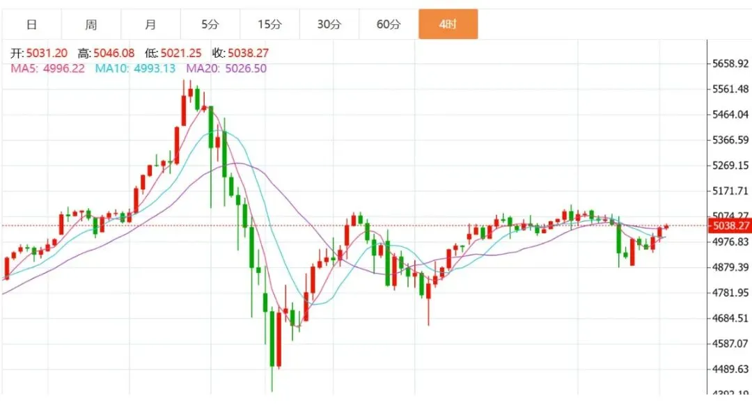 日线结构上来看,昨日大阴线贯穿跌破均线带,本周以来多头苦心坚守的均线带阵地失守,也就意味着行情结束反弹,或将重启中期级别的调整。日内上方先关注对均线带压力的测试,即4980-5000一带争夺,如果今日不能收回至此压之上,那么昨日大阴线的影响力或将会在下周得到彰显,即可能下周出现连续的下跌调整,甚至可能再回4700-4600区域。