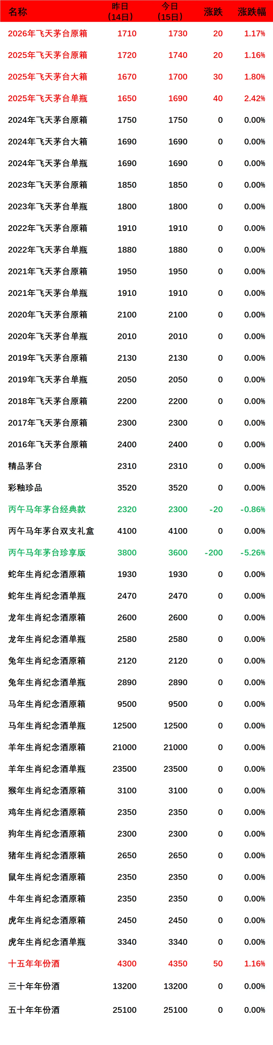 2025年飞天茅台原箱、大箱和单瓶,2026年飞天茅台原箱及十五年年份酒上涨;
