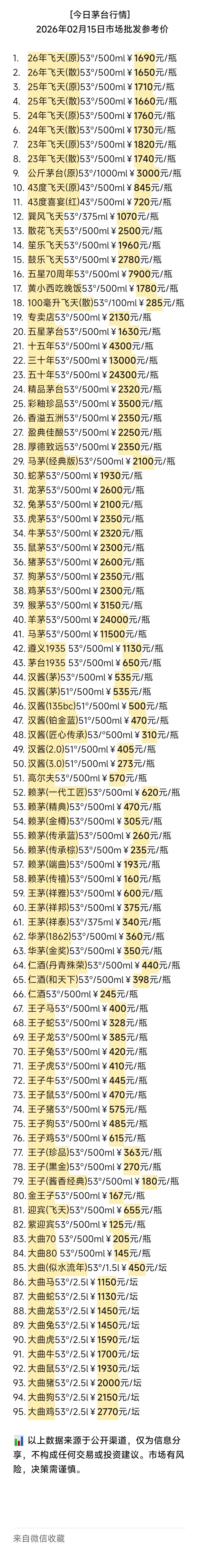 🔍【数据说明】本文数据来源于2026年02月15日今日酒价、百荣酒价、酒价参考等主流公开平台发布的批发参考价,并结合部分渠道反馈的交投热度描述。数据经多源比对与交叉验证,以"今日酒价"为最终报价基准。内容由AI生成逻辑框架,经专业人工校对审核。