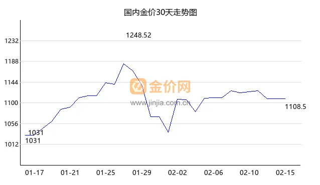 今日国内金价下跌,现价1108.50 元/克,下跌-1.47%,今日开盘价0.00,最高价0.00,最低价0.00。