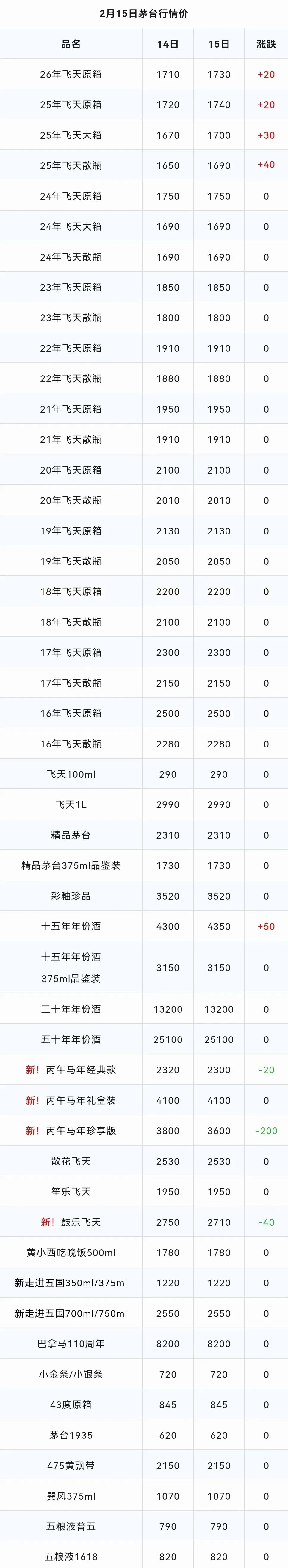 由于公众号平台修改了推送规则,如果不想错过“茅酒顾问”行情价,记得读完点一下“在看”,这样每次新文章推送才会第一时间出现在你的订阅列表里。今日(2月15日),从茅酒顾问发布的白酒价格行情监测数据显示,近段时间整箱茅台价格一直在1550徘徊,散瓶在1540左右,今日53度贵州飞天茅台(500ml)一批价跌至1740元左右!散飞在1690。