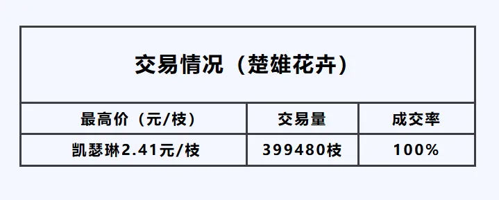 15日,姚安花拍中心全渠道交易总量约为559790枝,今日交易量较前一交易增加,总体购买力小幅上涨。成交率下滑,交易情况如下: