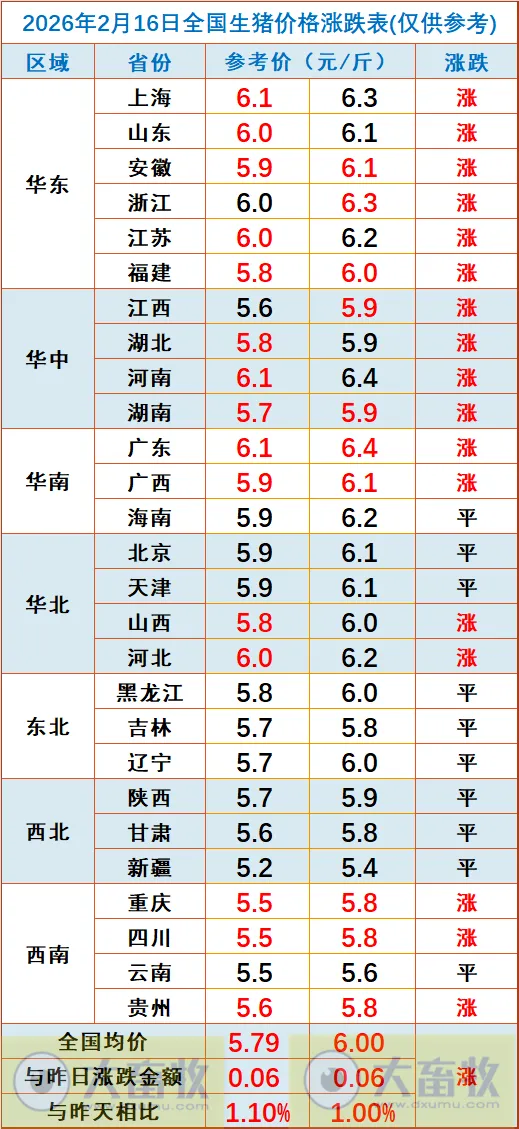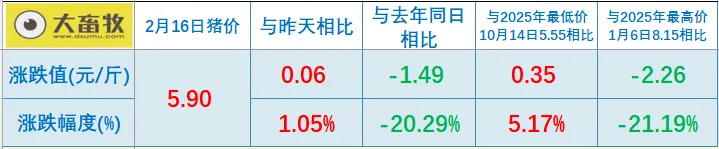 大畜牧小编根据我国27省的猪价数据,计算出2026年2月16日全国平均猪价为每斤5.90元,比昨天上涨0.06元,涨幅为1.05%,涨幅扩大,连续4天上涨,累计上涨0.16元,为近6天最高价;