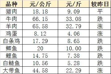 猪肉:平均价格为18.18元/公斤,比昨天下降0.2%。