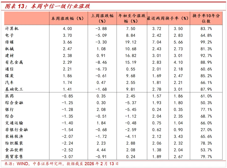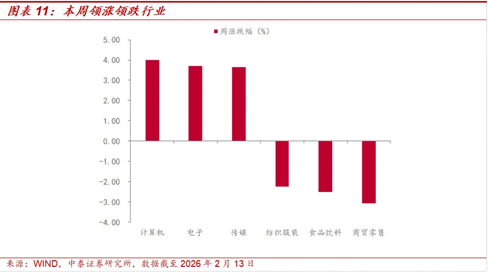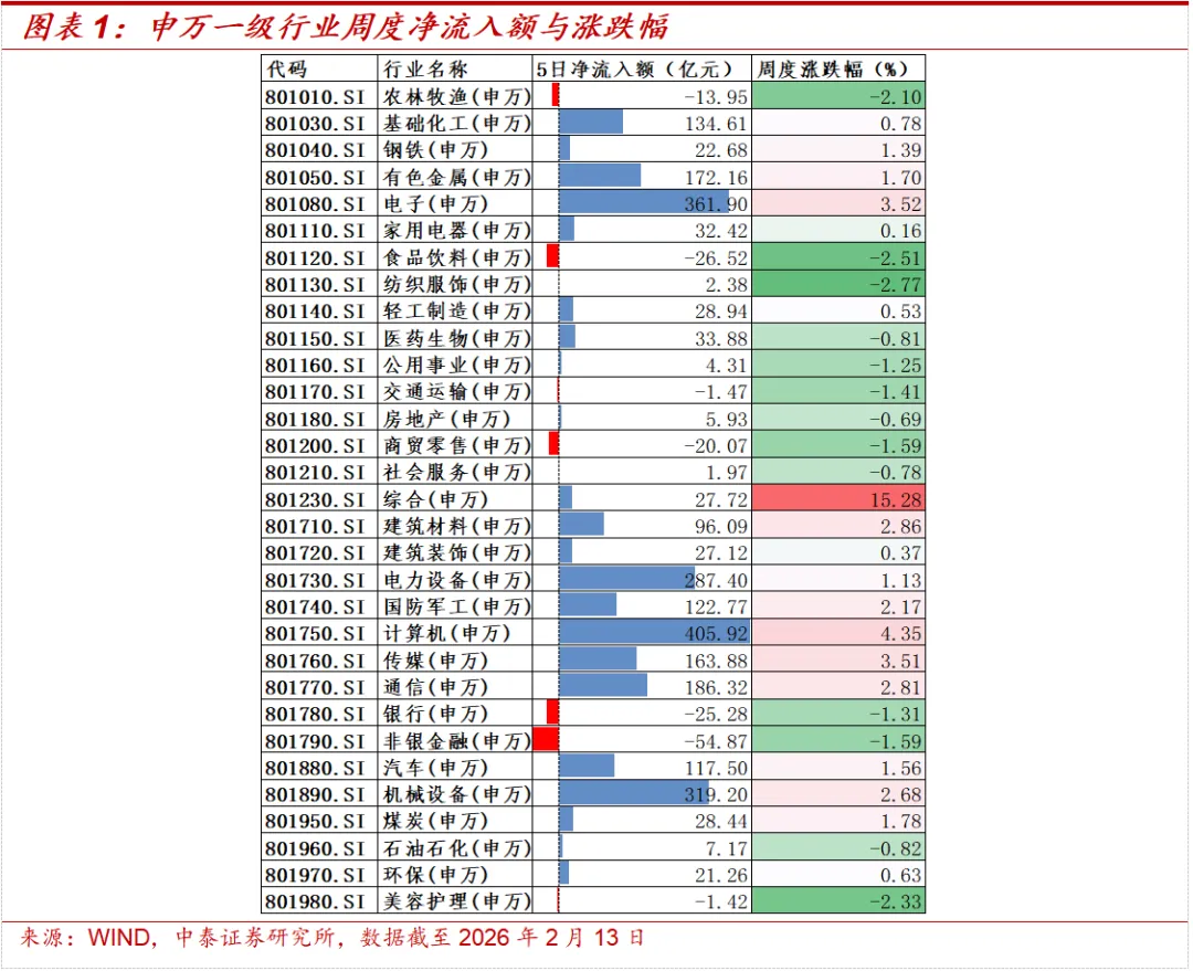 农历蛇年(2025年2月5日至2026年2月13日)行情本周正式收官,上证指数累计上涨25.58%,创业板指上涨58.73%,科创综指上涨64.20%,科技板块成为全年市场核心驱动力。本周科技仍然是支撑市场的主线行情,科技大类板块周度涨幅达3.54%,其中计算机(4.35%)、电子(3.52%)、传媒(3.51%)、通信(2.81%)在行业中排名靠前。相对而言,年初涨幅较大的周期板块进入震荡整理(0.75%),价值属性较强的消费板块仍然未见起色(-1.53%),资金选择进攻的主要方向是科技。从时间维度看,科技板块涨幅主要集中在周二(2月10日)前,周三开始也进入震荡回落行情,资金普遍进入节前防守状态。从资金流向看,电子、计算机行业指数周度净流入额分别为361.90亿元与405.92亿元,在行业中排名前两位,传媒、通信指数周度净流入额也均超过150亿元,显示资金对科技主线的配置意愿依然强烈,节后行情可期。