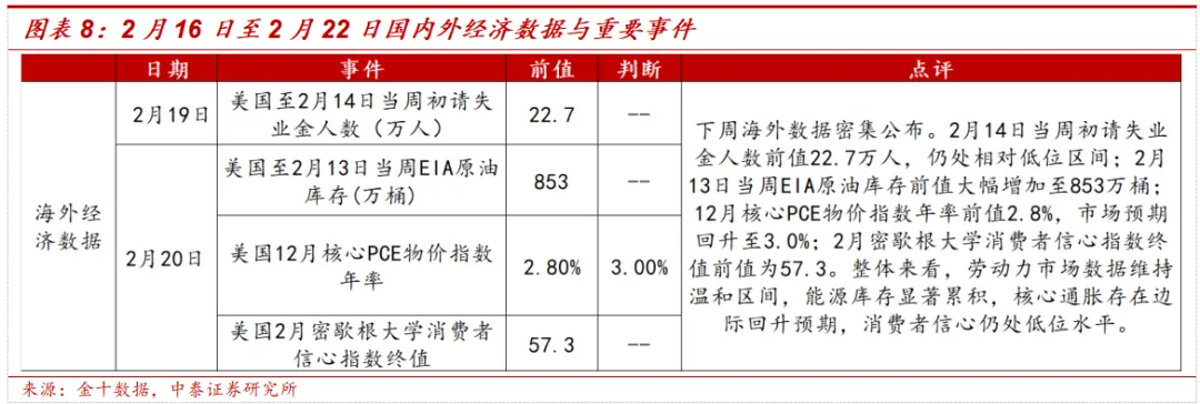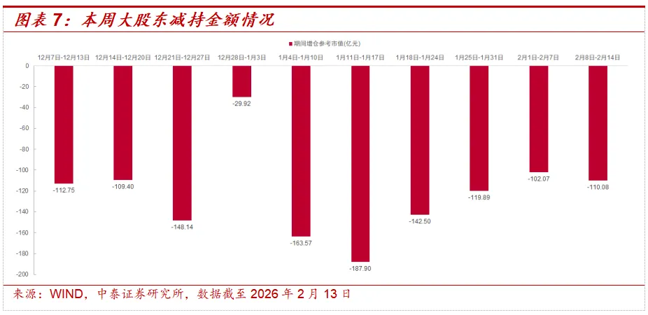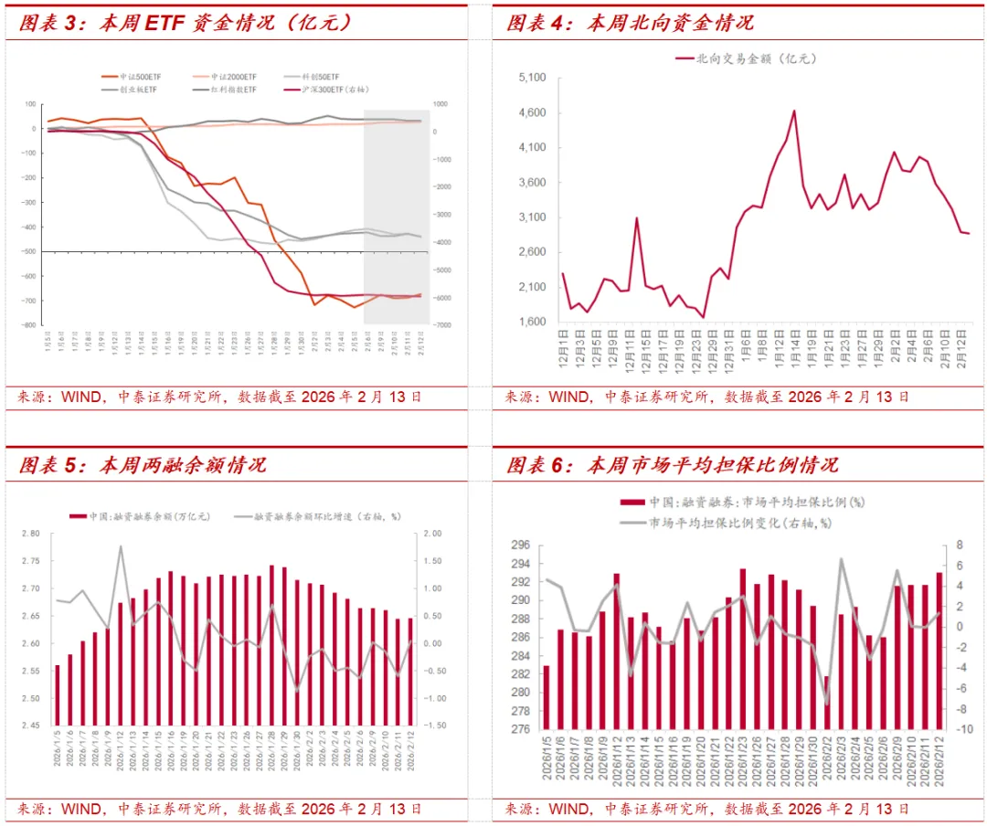 从资金面看,本周各渠道以平衡或流出为主,节前增仓意愿明显弱化。ETF资金基本保持平衡,杠杆资金与北向资金流出,产业资金周度净流出幅度小幅上升。首先,从主要指数ETF看,沪深300、科创板、创业板ETF周度流出,中证500周度流入,中证2000、红利指数ETF净流入接近0,长期资金交易活跃度下降。其次,北向资金交易量周度趋势持续流出,交易额从高位明显回落。第三,大股东减持幅度本周略有增加,但整体水平仍较低。第四,杠杆资金周度整体小幅流出,融资融券余额从1月末高位持续下降,市场平均担保比例有所增加,两融风险下降。本周资金面显示在春节前,投资者风险偏好较低,市场普遍担忧长假期间不确定性,但也为节后增量资金积蓄力量。