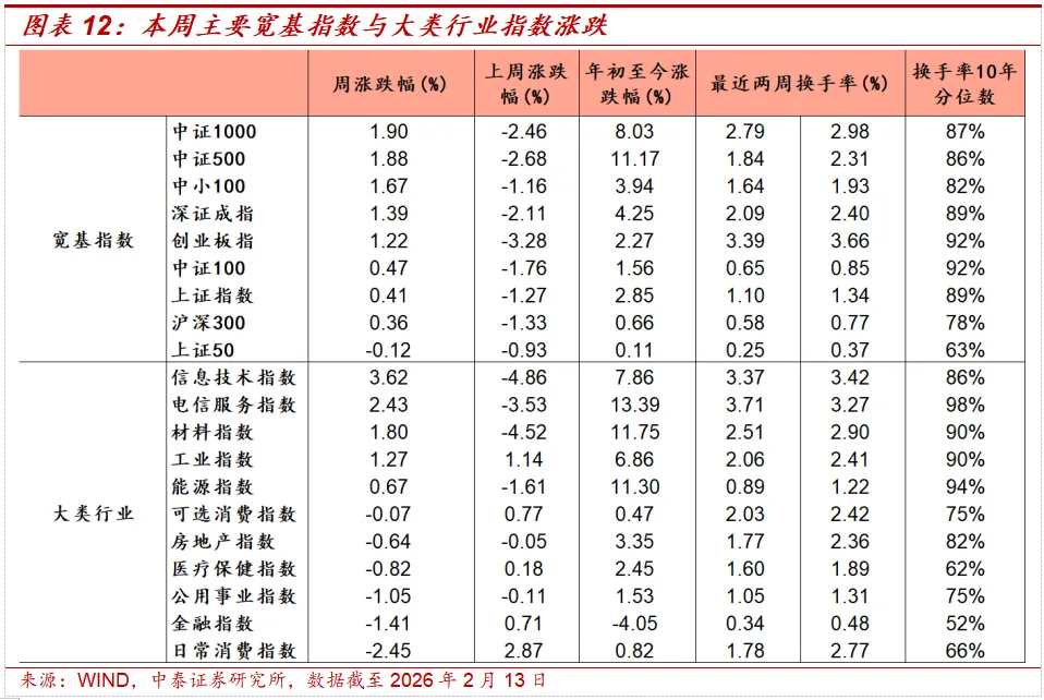本周A股市场整体呈现冲高后震荡整理格局,指数层面小幅上行,但量能持续收缩,结构性赚钱效应边际回落。从宽基指数表现来看,市场仍维持一定韧性,万得全A指数周度上涨1.11%,沪深300上涨0.36%,中证2000上涨1.17%,中小盘相对占优,权重指数表现偏弱,结构分化特征延续。成交层面,市场活跃度明显降温。万得全A日均成交额为2.11万亿元,较上周下降12.28%,量能连续回落,显示节前资金风险偏好趋于收敛。尤其在农历年前最后一个交易日,成交额再度跌破2万亿元关口,表明短期增量资金观望情绪升温。赚钱效应方面,本周日均上涨家数占比约45.63%,较上周小幅回落,个股普涨格局未能延续,市场由情绪驱动逐步转向存量博弈阶段。指数虽保持上涨,但内部轮动加快、个股分化加剧,结构性行情特征更加明显。