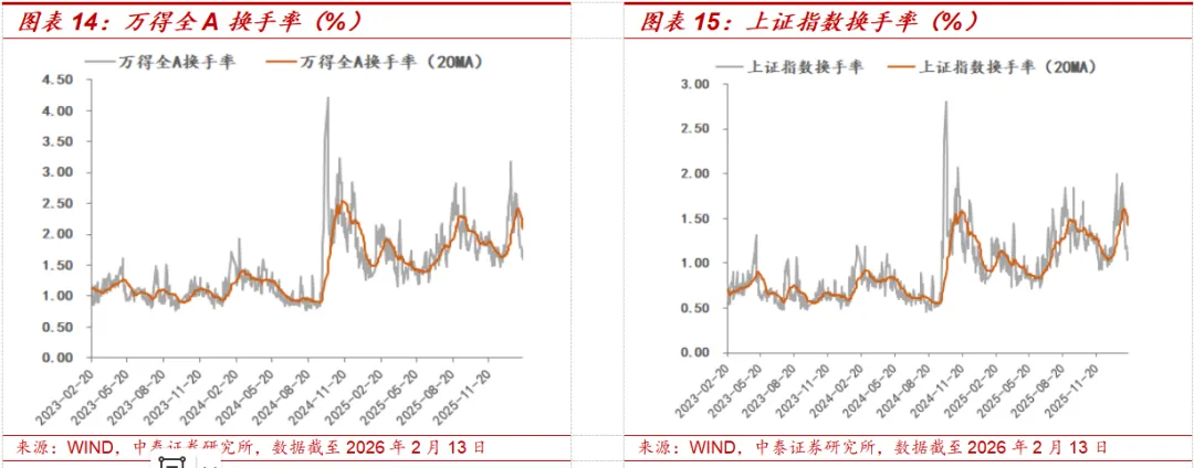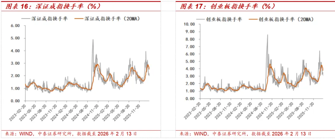 全市场活跃度:过去十年全A日均换手率区间大致为0.4%-3%,20日平滑后本周全A换手率较上周有所下降。截至2月13日,5日平均换手率达1.7%,处于十年分位的88.7%。创业板指换手率区间大致为1%-5%,20日平滑后创业板指换手率有所下降。截至2月13日,创业板5日平均换手率为3.39%,处于历史分位的92.4%。