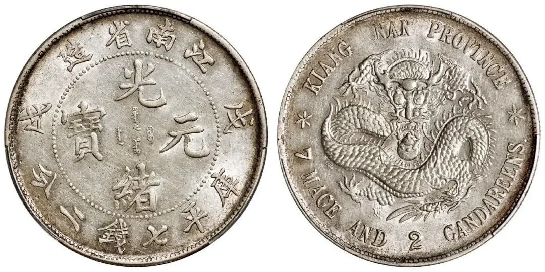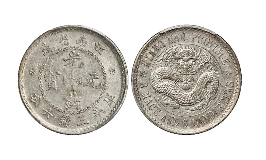 1898年无纪年江南省造光绪元宝库平三钱六分银币一枚,俗称“老江南”,齿边,英国伯明翰喜敦造币厂制模,南京造币厂铸造,流通不久即被“戊戌江南省造”干支纪年号币所取代;存世的各种面值“老江南”之中,三钱六分与三分六厘铸额最少,所见大部分打有戳印或磨损严重;此枚龙鳞满打,底版基本完好,原色原光,其状态于“老江南”半圆流通币已属十分难得。