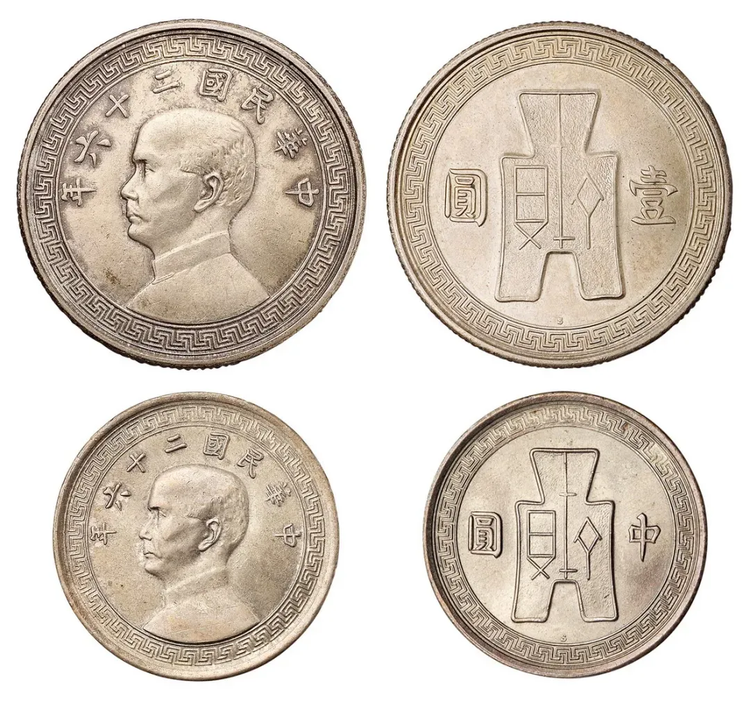 中华民国二十六年孙中山像背布图壹圆、中圆银币样币各一枚,未发行,存世极罕,完全未使用品。