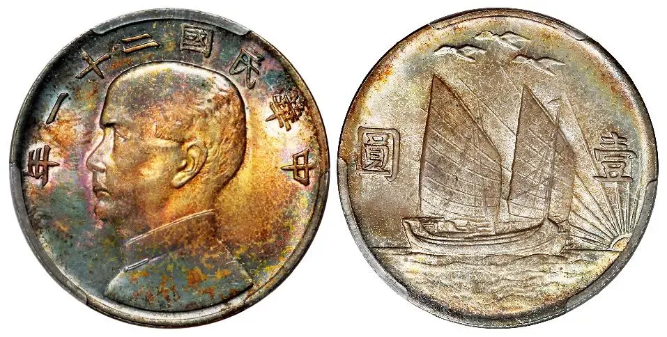 民国二十一年孙中山像背帆船三鸟壹圆银币