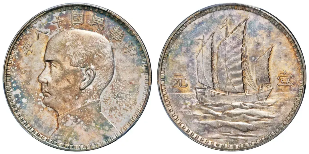 民国十八年意大利版孙中山像背三帆船壹元银币样币一枚,系1929年南京政府研拟新国币方案,邀请美国、奥地利、意大利、英国及日本五个国家的造币厂雕模送样比稿时,由罗马造币厂总雕刻师莫蒂(Attilio Motti)刻模,杭州造币厂试铸,未发行,正面孙中山像后被用作新国币图案;拍品铸工卓越,经典原始包浆,币面充盈瑰丽五彩原光,品相完美。