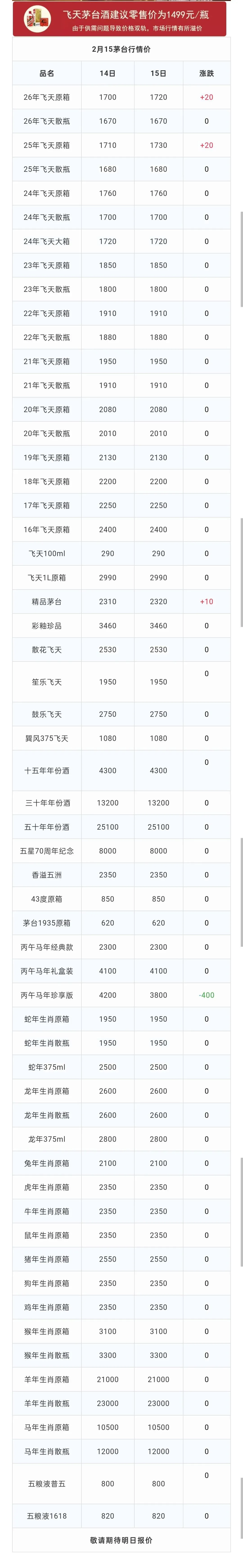 让人没想到的是,昨天下跌20元每瓶的26年、25年飞天原箱今日竟然再次迎来阶段性回调,每瓶上涨20元。前者从昨天的1700元上涨至1720元;后者从1710元上涨至1730元。