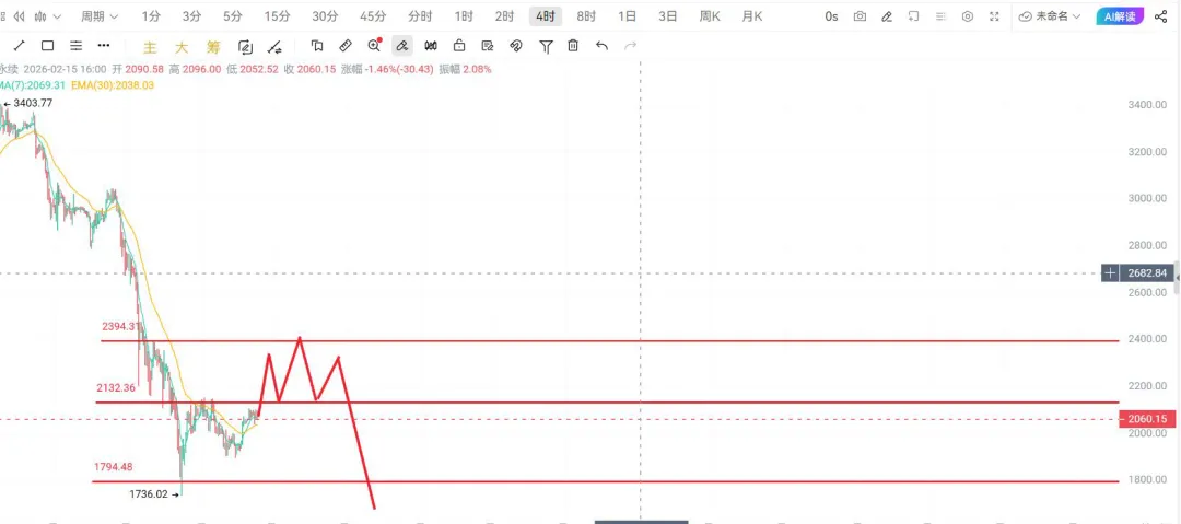 左侧是启明之星,若右侧走出日线级看跌吞没,会直接吞掉前面的底部形态,日线级别继续回调,下看 1940 附近。