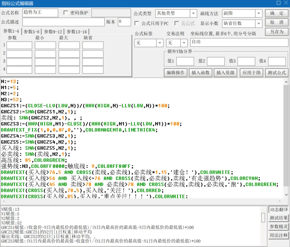 N:=13;N1:=5;N2:=2;N3:=52;GHCZS1:=(CLOSE-LLV(LOW,N))/(HHV(HIGH,N)-LLV(LOW,N))*100;GHCZS2:=SMA(GHCZS1,N2,1);卖线: SMA(GHCZS2,N2,1), , ;GHCZS3:=(HHV(HIGH,N1)-CLOSE)/(HHV(HIGH,N1)-LLV(LOW,N1))*100;DRAWTEXT_FIX(1,0,0.07,0,''),COLORMAGENTA,LINETHICK4;GHCZS4:=SMA(GHCZS3,N2,1);GHCZS5:=SMA(GHCZS4,N2,1);买入线: SMA(GHCZS5,N2,1);必卖线: SMA(卖线,N2,1);高压线: 85,COLORGREEN;强势线:N3,COLORFF0000;触底线: 9,COLORFF80FF;DRAWTEXT(买入线>76.5 AND CROSS(卖线,必卖线),必卖线*1.15,'建仓!'),COLORWHITE;DRAWTEXT(买入线>56 AND 买入线<=76 AND CROSS(卖线,必卖线),卖线,'有走强趋势'),COLORCYAN;DRAWTEXT(买入线<45 AND 卖线>78 AND 必卖线>78 AND CROSS(必卖线,卖线),必卖线,'跑'),COLORGREEN;DRAWTEXT(CROSS(买入线,78.5),买入线,'关注!'),COLORRED;DRAWTEXT(CROSS(买入线,85),买入线,'重点关注!!!'),COLORWHITE;