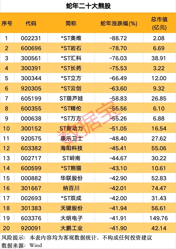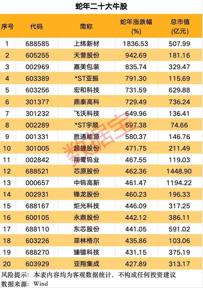 据数据宝统计,蛇年二十大牛股全年涨逾420%,二十大熊股全年跌逾40%。