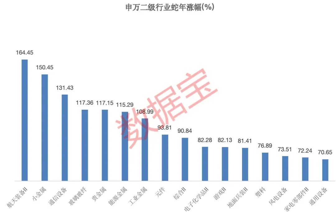 以申万二级行业划分,航天装备Ⅱ、小金属指数年涨幅居前,依次为164.45%、150.45%;通信设备、玻璃玻纤、贵金属、能源金属等指数紧随其后,年涨幅均在100%以上。