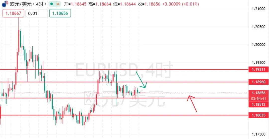 2、4 小时级别:维持上升趋势中的震荡整理,收敛三角形形态预示短期将有方向性突破。操作上以回调做多为主,重点关注 1.1850-1.1855 支撑区间的企稳信号,同时警惕突破行情。若向上突破 1.1880,将打开新的上行空间;若向下跌破 1.1840,则需调整策略,防范短期回调风险;
