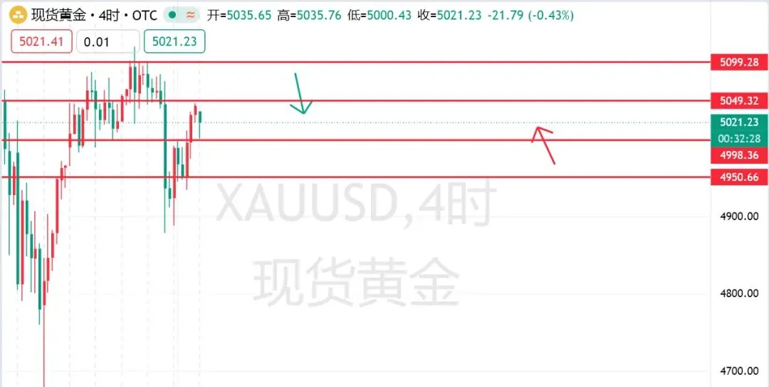 2、4 小时级别:呈现震荡上行通道中的整理蓄势格局,当前处于多空平衡向多头倾斜的状态,5000-5010 美元为短期生命线与核心支撑带,5040-5050 美元为第一阻力区,5070-5080 美元为强阻力区;