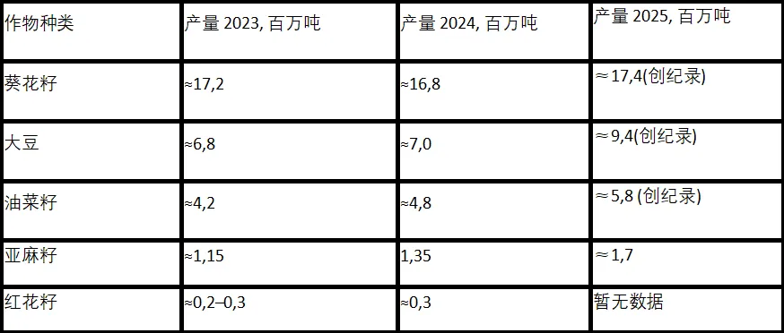 近年来,俄罗斯油籽产量显著增长,多种作物产量均创历史新高。以下是2023-2025年主要油籽作物的收成表。