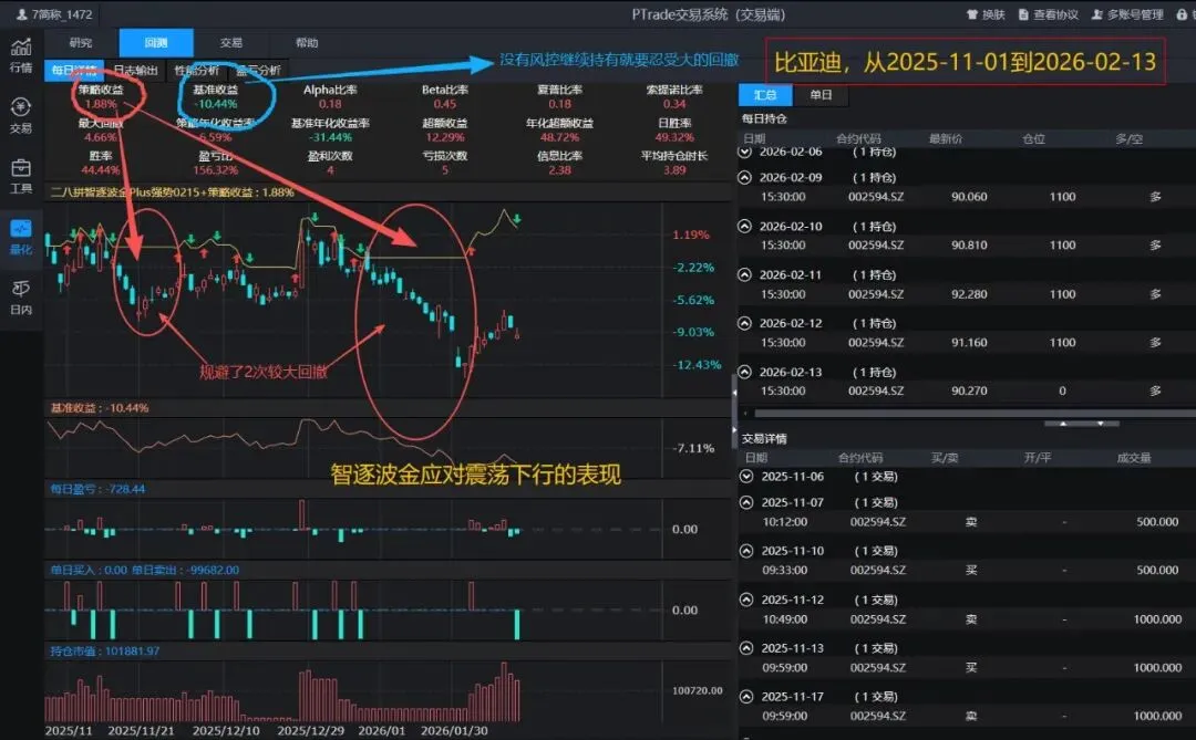 回测是从2025-11-01(股价100左右)开始,到2026-02-13(90.2)为止。若是持股不动,浮亏10%左右;策略表现还能小赚