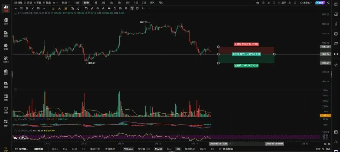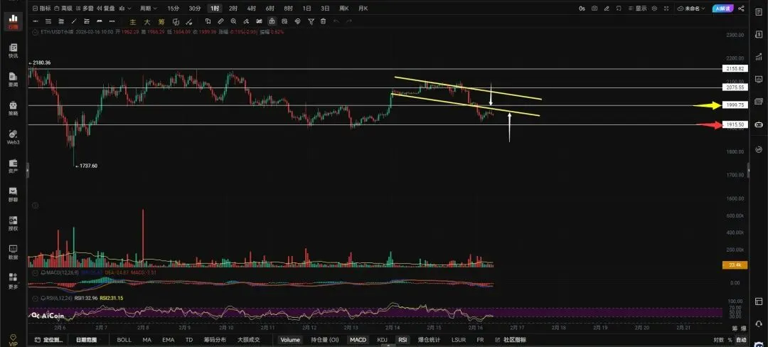 4小时级别跌破1940向下看1894-1847,二饼2000整数关口被跌破旗形被跌破,在跌破旗形之后尝试重新收回旗形内部运行但是失败了,现在的2000整数关口由原来的支撑变成了当下的阻力,如果不能重新回到2000上方运行,1915必须要去摸那么一摸,1915被跌破能到哪等走到了再看,总之现在无论大饼还是二饼的走势对多头不是很友好,