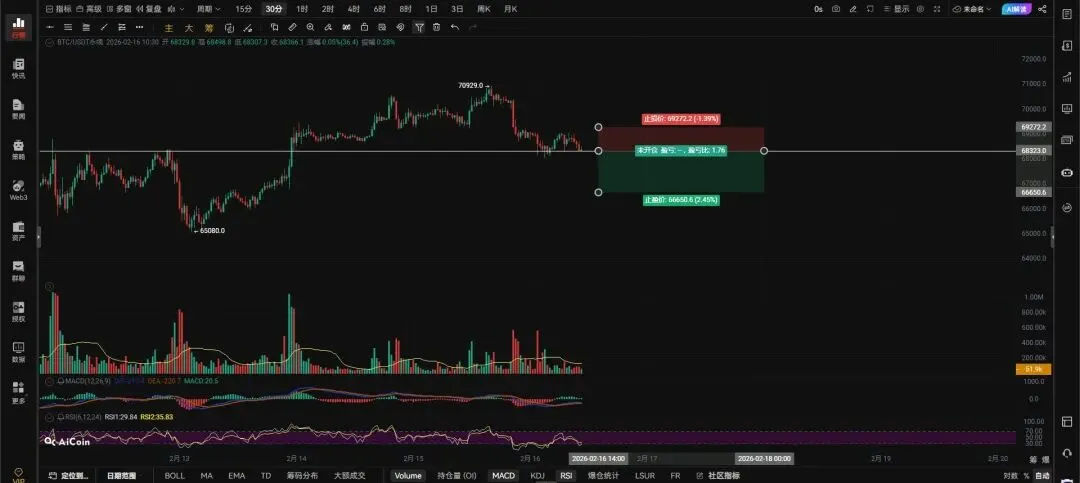 大饼已经跌破了看跌旗形,当下正在测试68400的支撑如果68400撑不住就会重新回到下方的67262-66585这个区间去运行,并且跌破68400白框圈出的这段多头趋势就会被破坏掉,现在69145就是大饼的阻力,能重新回到69145上方走盘整才能阻止大饼继续走阴跌还可以期待向上反弹一波,上不去69145你也不用在期待了也没啥期待的了不给你来一个高挂还原就算捡到了。我就说周末这波拉盘在没有利好消息的推动下怎么能拉盘,拉盘也是掠夺上方的流动性果真是这样。既然大饼已经选择这么走了那就让它继续吧!大过年的别让交易影响了你的心情。