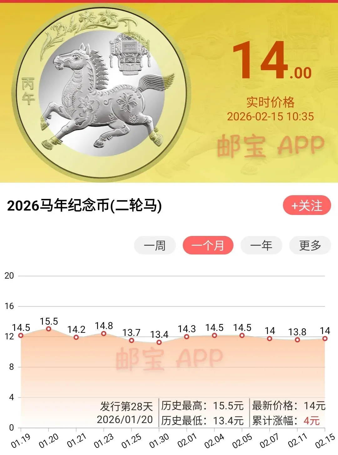 今天是除夕,在这里祝广大收藏爱好者新春愉快,万事大吉,龙马精神,马到成功。在这欢度佳节的日子,2026年马年普通纪念币,目前也已经出现明显的回升,记得前段时间市场行情也跌破了14大关,但是在春节假期市场行情也迎来了回升。