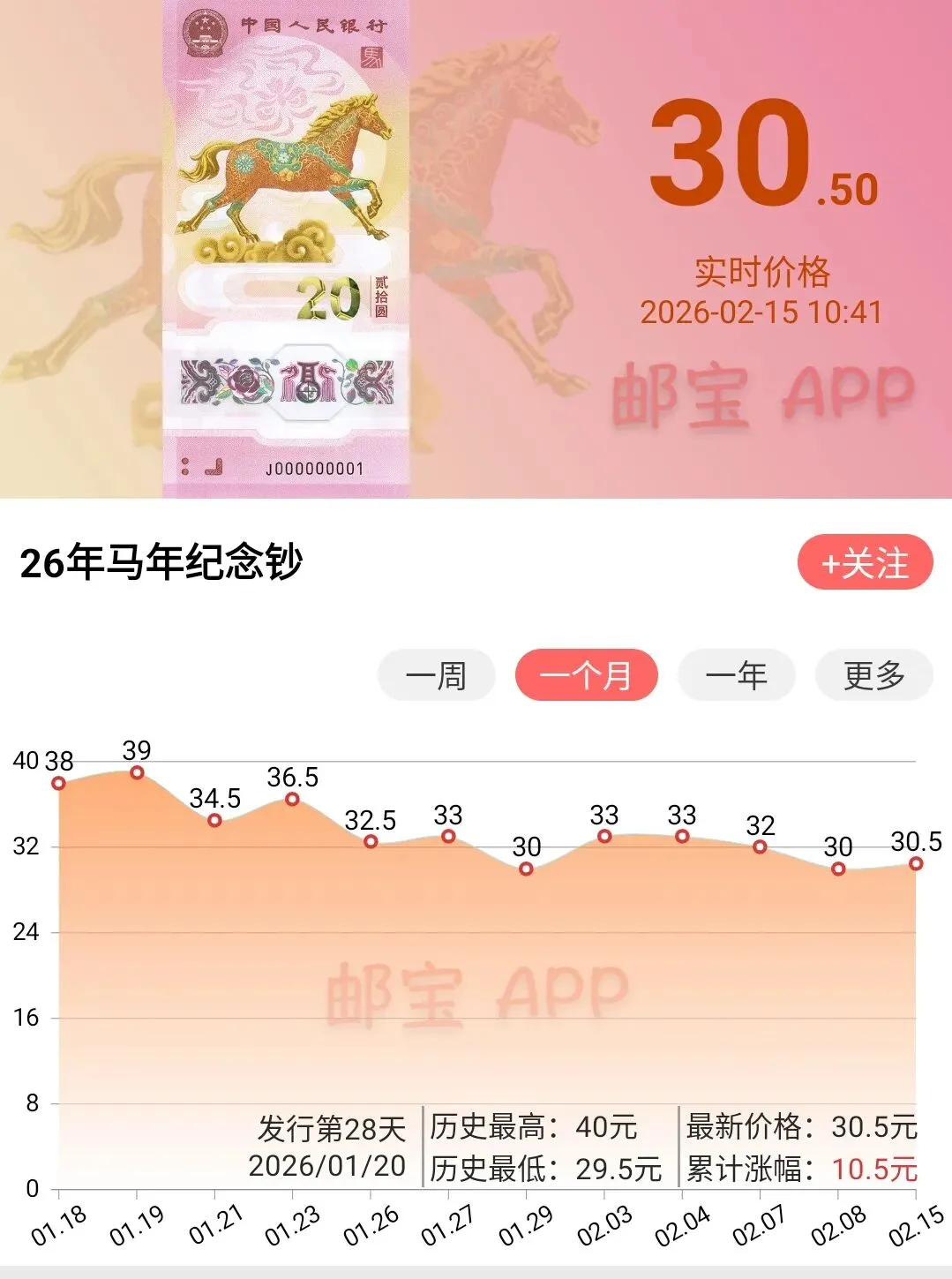 2026年马年纪念钞目前来看市场行情并不是太活跃,散钞带4今天看了一下收购报价,也已经下跌到了29.5元左右,散钞无4收购报价基本上在30.5元左右,整体来看散钞通货目前也能保持在29.5~30.5元。