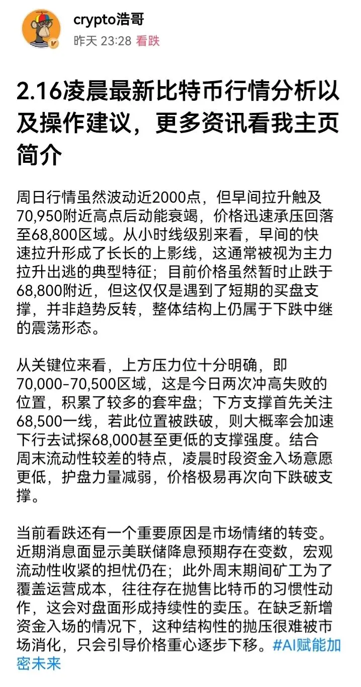 总体而言,凌晨的探底回升更像是一次多头主动防守后的反击,短线的恐慌情绪已得到释放,市场重心逐步上移。只要后续不再有效跌破68000美元关口,当前的回升就有望成为新一轮反弹的起点,多头仍掌握中期主动权。