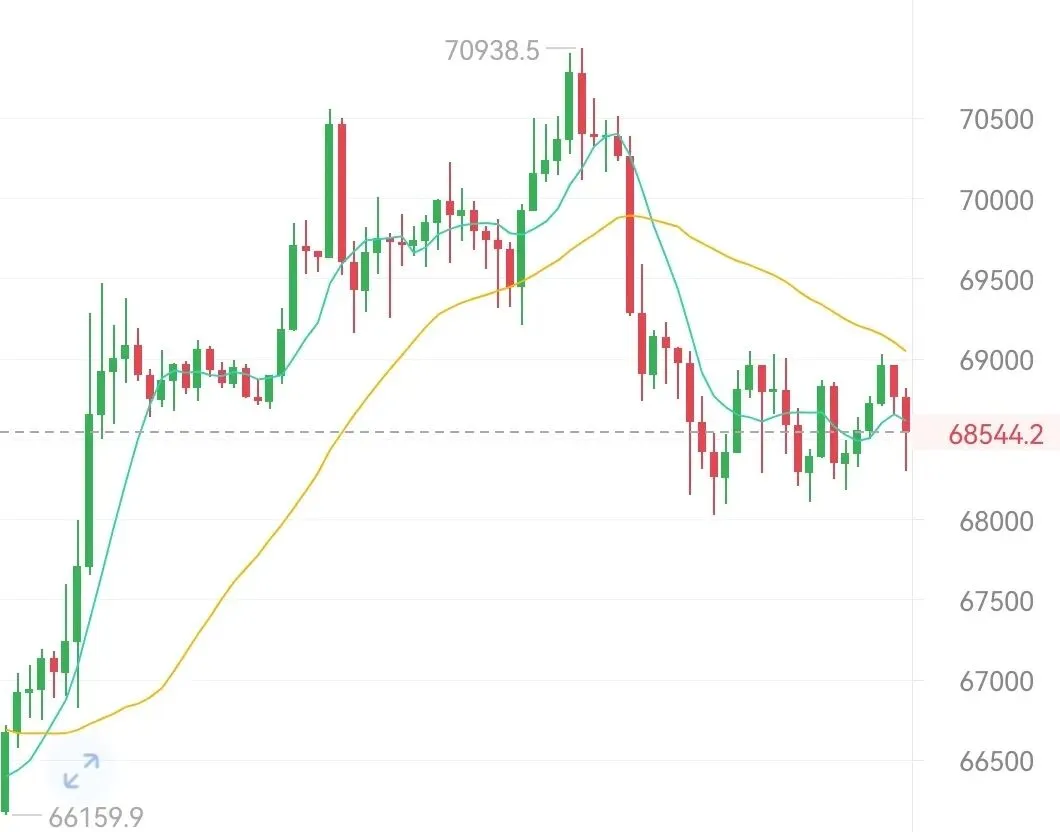 币圈沉浮,心态为王:真正的王者不是一夜暴富的幸运儿,而是无论涨跌都能保持平和心态的智者。面对波动要心如止水,不盲目追涨,不轻易割肉昨日大饼冲高至70938承压后快速回落,形成明确的阶段性高点。短期MA7均线拐头向下,与MA30形成空头排列,价格持续运行于双均线下方,空头压制显著。下方68029虽形成短暂支撑,但反弹力度孱弱,未能有效站上69000关键关口,且量能配合不足,后续下破风险加剧。消息面叠加节前资金获利了结情绪,市场买盘意愿低迷!