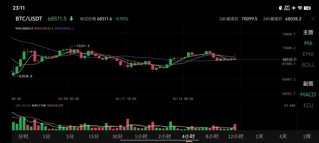 · 短期走势:当前价格68511.5 USDT,略高于5日均线(MA5: 68602.8),但承压于10日均线(MA10: 69131.4)。MA5与MA10形成死叉,显示短线反弹阻力较大。