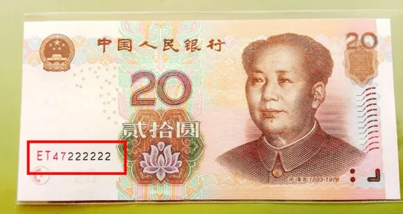 这样的纸币最耐人寻味之处,恰恰在于它的“几乎没有差别”。它仍是可流通的20元,仍是荷花与桂林山水的组合,仍是第五套人民币统一的庄重与克制。只是右下角那串数字,在某些时刻会让人多看一眼——五个“8”排在尾部,整齐得近乎刻意,而4与7的缺席又让整段号码更像被刻意筛选过。实际上它只是概率的结果,落在一张纸币上,落在某次找零里,落在某个人的视线停顿里。
