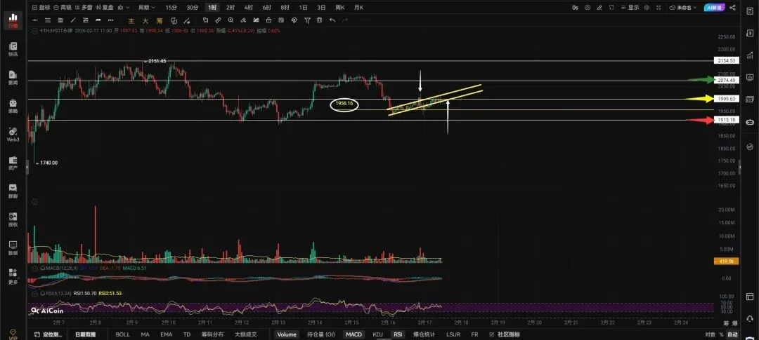 4小时级别跌破1949向下看1903-1858,二饼一直在旗形内部走震荡,跌破旗形就要回踩下方1956的支撑,跌破1956红色箭头所指的1915自然会给到,想上涨必须突破2000才能向上看上方白色箭头所指的高一和2074,上不去2000涨不起来,散会。