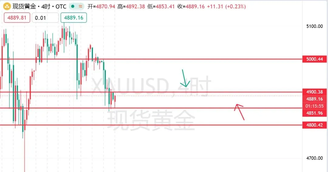 今日黄金呈先抑后扬的震荡修复格局,伦敦金现最新报4886.65 美元 / 盎司,纽约金期货报4906.3 美元 / 盎司,价格在凌晨触及4842 美元低位后反弹,目前围绕4880-4900区间震荡。美元指数走强、美伊核谈判取得进展削弱避险需求、亚洲假期流动性低迷是主要压制因素;而美联储官员古尔斯比释放年内多次降息信号、央行持续购金则提供支撑。技术面显示日线级别大阴破位后有反弹修复需求,4 小时级别超卖后出现企稳迹象,关键支撑位4850-4860(日内低点 + 技术支撑),关键阻力位4890-4900(整数关口 + 技术阻力)。操作策略以反弹做空为主,低位企稳后轻仓试多,严格控制仓位与止损,重点关注美国成屋销售数据与美联储会议纪要。