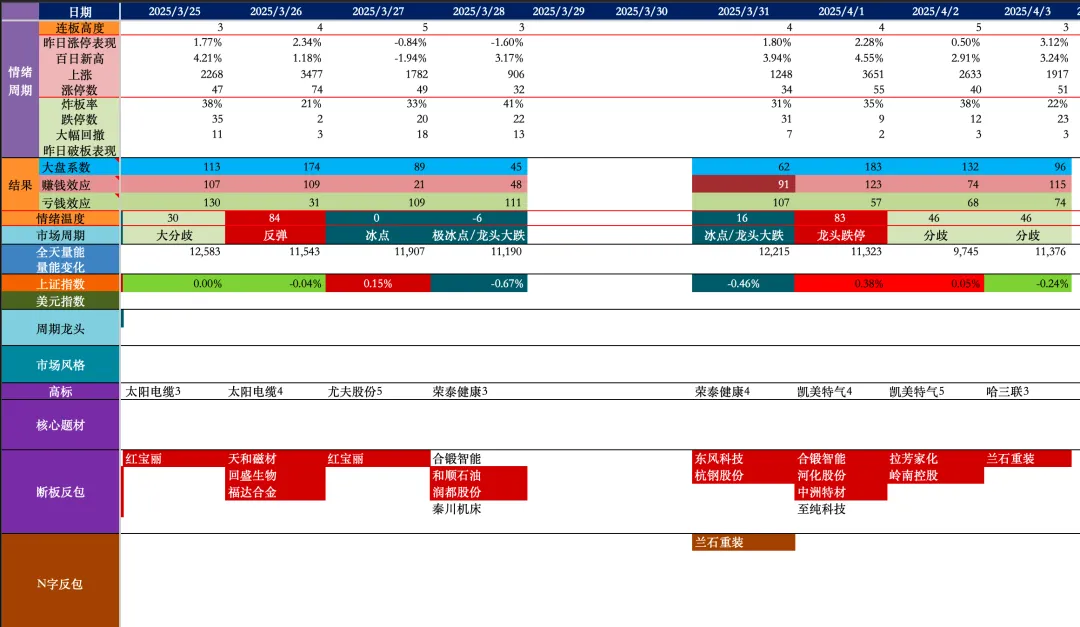 震荡行情,是全年当中持续时间最多的时候!具体来看:这段时间,伴随着DeepSeek在过年期间的发酵,年后迎来一波小的炒作高潮!这段时间,经过春节期间发酵,开盘后市场交投热情比较高,前三个交易日市场迅速从1.2万亿放量到了1.5万亿,然后再放量到接近2万亿。在此之后,市场成交额基本维持在这个水平,市场在DeepSeek技术突破的乐观情绪与关税担忧之间反复摇摆。保持着震荡的态势。1.5万亿-2万亿的成交额,维持叨叨3月下旬,直到3月25日之后,市场缩量到了1.1-1.2万亿左右。核心特征:市场缺乏统一的向上或向下合力,表现为 “电风扇行情”。资金在不同板块间快速切换,追涨杀跌容易亏损。龙头启示:没有总龙头,只有强势的板块龙头,龙头较少以连板的形式出现,多是弱转强、N字反包或者断板反包为主