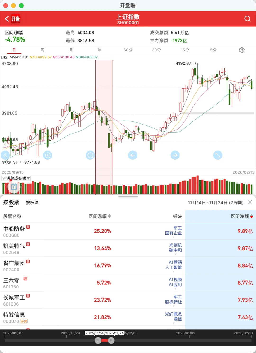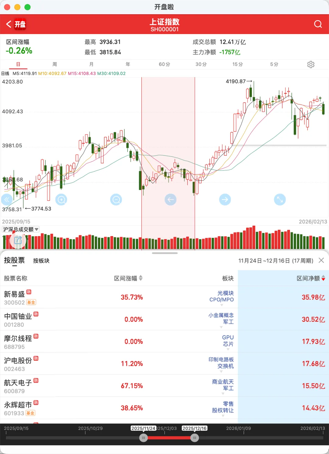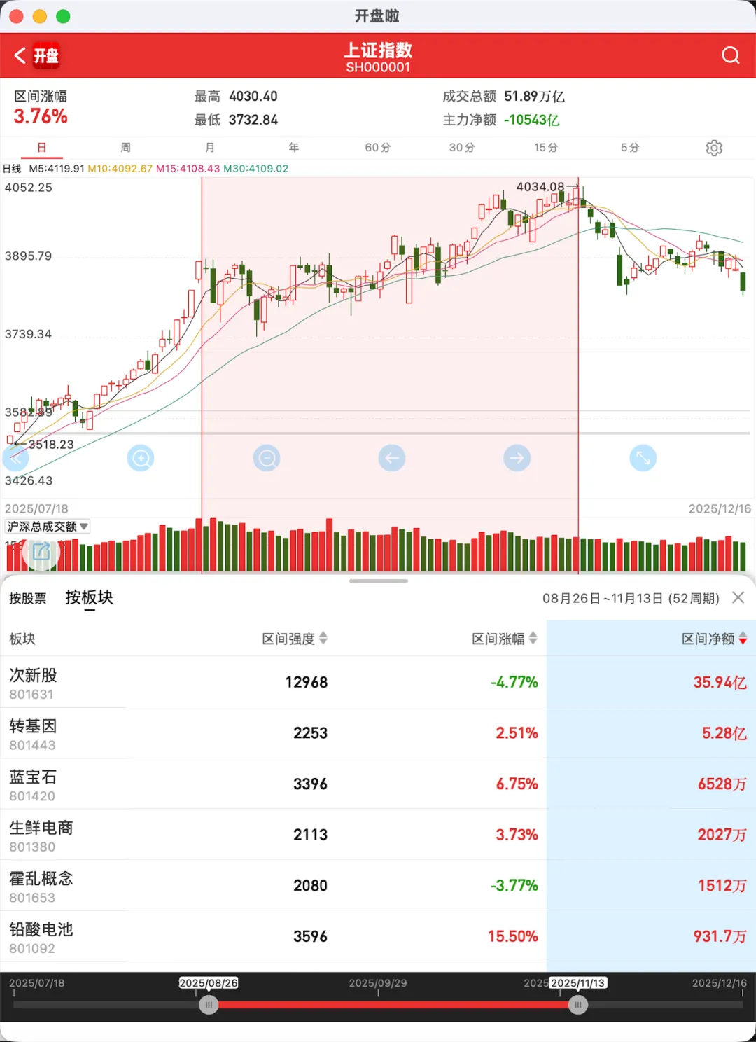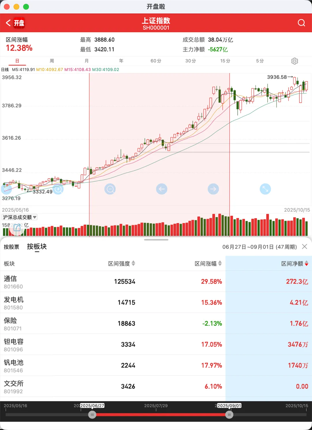 主升阶段 | 2025年6月下旬至8月底 | 量能:量价齐升,日均成交额稳定在1.6万亿元以上,8月更出现连续28个交易日破万亿的盛况,两融余额持续攀升。指数:上证指数从6月23日起连拉大阳线,突破盘整平台,一路攻克3700、3800、3950点,于10月31日触及3950点,期间最大涨幅显著。主线:AI算力(光模块、服务器) 成为绝对核心,龙头股(如中际旭创、新易盛)涨幅惊人,并带动半导体、有色金属(受益于全球补库存及AI需求)板块全面走强,赚钱效应高度集中。 | 产业趋势与业绩共振:光模块等公司一季报、中报业绩数倍增长,验证了AI算力需求的爆发性,形成“戴维斯双击”。策略:重仓主线,持股待涨。聚焦业绩确定性最高的龙头品种,避免频繁切换,享受趋势带来的主升浪利润。 |