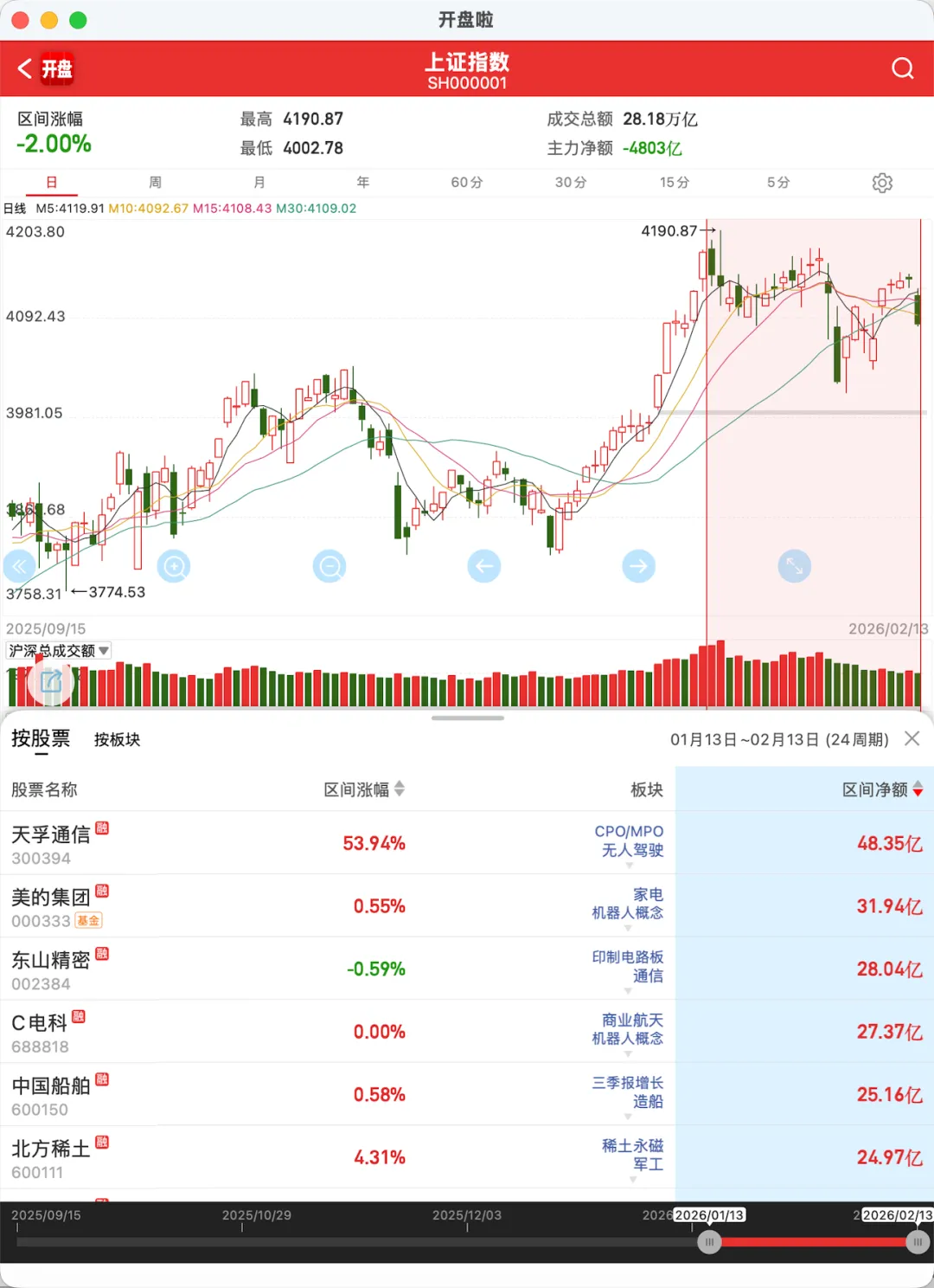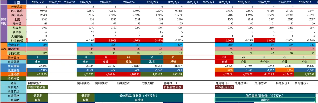 这段时间,因为GJD降温,市场开启震荡模式,先是商业航天板块开始补涨模式;后二次退潮后,开启轮动模式。具体来看,1.14-1.30这段时间,市场算是高位震荡期。1.30日之后,市场二次退潮,此后市场进入低位震荡期。1、大局观永远比策略更重要,大局观就是辨明市场所处的阶段。市场遵循N字拉升的规律,分别是:主升、震荡、主跌。2、逻辑得到认可是牛市启动的内在灵魂,市场持续放量是逻辑得到认可的表现。3、震荡期是持续时间最久的,又分为高位震荡和低位震荡。4、市场经过一段时间的主升浪之后,会进入高位震荡期,高位震荡期后必然伴随着一波杀跌,然后市场进入低位震荡期。5、震荡期的典型特点,就是缩量,表现为题材轮动和补涨,也就是场内资金的博弈为主。6、主升浪往往都是在低位震荡期中诞生的,主线题材也是在轮动中得到认可。7、不同时期的策略也是不同的,主升期龙头战法、高位震荡做补涨、低位震荡做切换;8、无论是震荡还是主升,弱转强依然是效率最高的策略。
