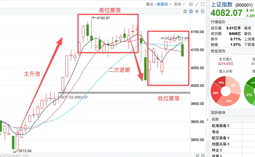 这是比较经典的一段走势,市场结束主升浪之后,开始进入到高位震荡阶段。