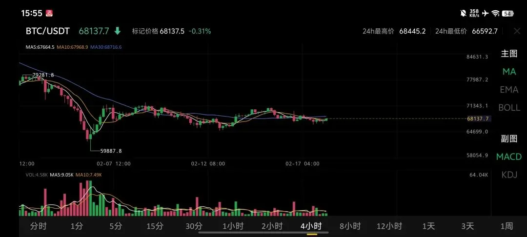 * 短期走势:近期价格在 $68,000 附近形成横盘震荡,多空力量暂时均衡。上方均线(MA30: $68,716)构成压制,下方前期低点($59,887)提供远期支撑。