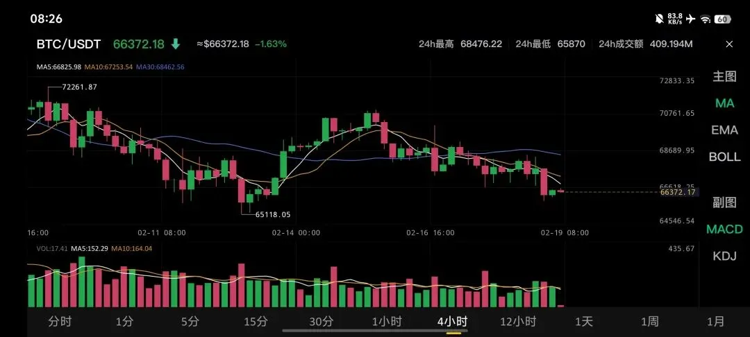 · 4小时图:K线连收阴线,均线系统空头发散,若不能快速收回 66800 上方,可能进一步考验 65000 整数关口。