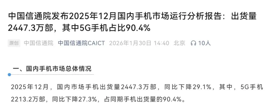 根据Counterpoint Research最新报告,2026年1月中国手机市场销量同比暴跌-23%,这一跌幅远超市场预期。