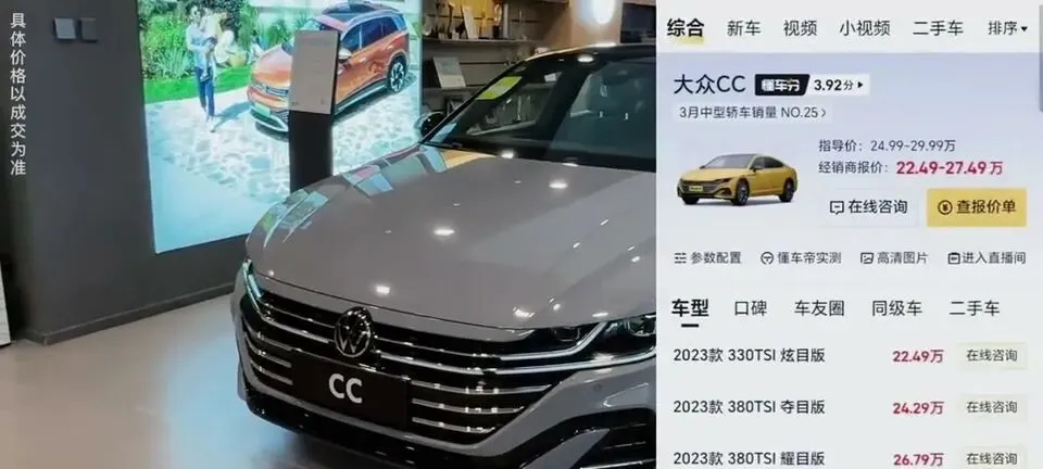 言归正传,这是一台大众CC。比如咱拍的这台380耀目版,指导价就来到了29万多。但现在的真实情况是:到店直降3万,你使劲砍的话差不多能砍下4万5——而且这还是一台顶配车型。