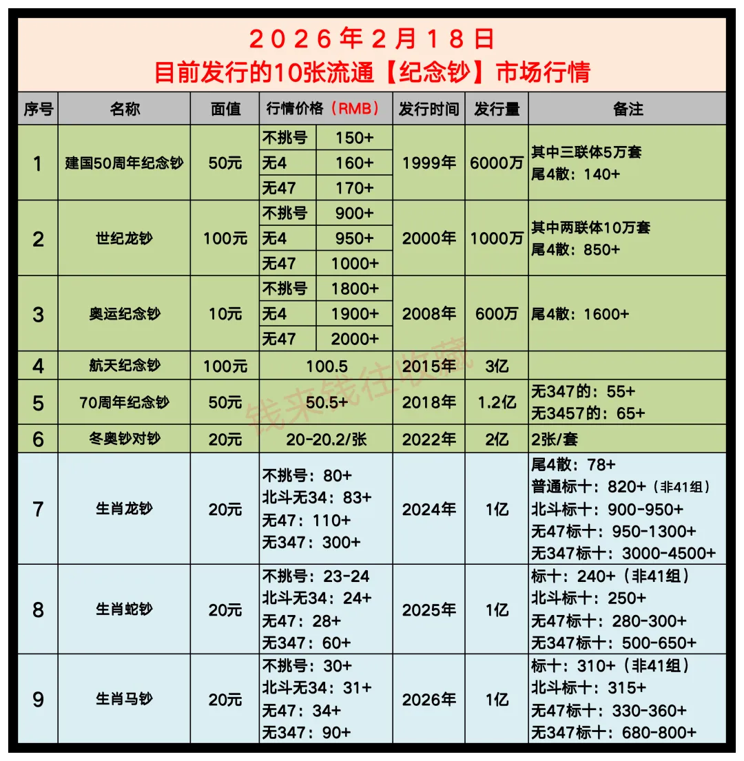 先跟大家说个整体大行情:2026年春节前后,纪念钞市场整体偏冷,呈现“老钞稳、新钞跌、生肖分化”的状态。简单说就是,早年发行的稀缺老钞(比如奥运钞、世纪龙钞)虽然有小幅回调,但整体抗跌;近几年发行的新钞(比如70周年钞、航天钞)基本在面值附近徘徊,没什么波动;生肖系列里,龙钞坚挺,蛇钞、马钞则出现了明显回落,大家心里先有个底。