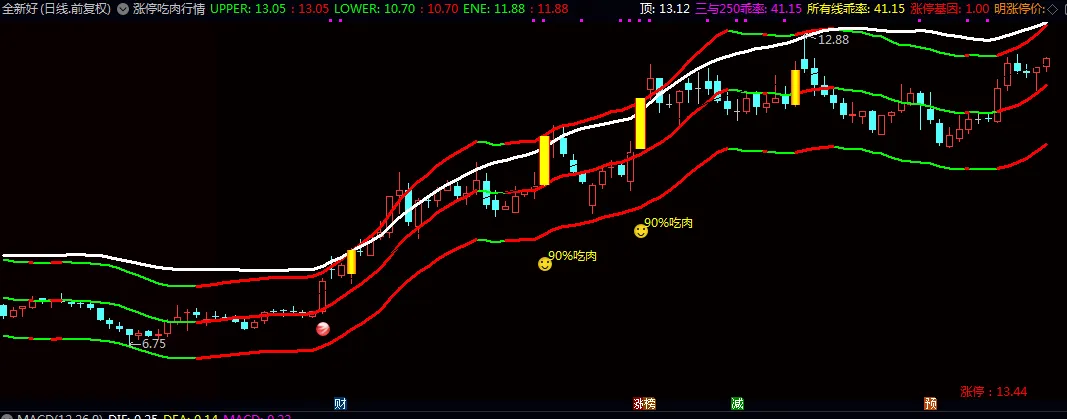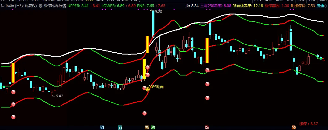 {涨停吃肉行情 - 主图指标}{轨道计算}UPPER: MA(CLOSE, N) + 2*STD(CLOSE, N), COLORRED;LOWER: MA(CLOSE, N) - 2*STD(CLOSE, N), COLORGREEN;ENE: (UPPER + LOWER)/2, COLORWHITE;{涨停判断}涨停价 := ZTPRICE(REF(C,1), 0.1);明涨停价 := 涨停价;流通市值 := FINANCE(40)/100000000;{突破信号}突破条件 := CLOSE > REF(HIGH, 1) AND CLOSE > UPPER AND VOL > MA(VOL, 5)*1.5;STICKLINE(突破条件, OPEN, CLOSE, 3, 0), COLORYELLOW;DRAWTEXT(突破条件, LOW*0.98, '😊90%吃肉'), COLORRED;{轨道变色}轨道颜色 := IF(CLOSE > ENE, RGB(255,0,0), RGB(0,255,0));完整源码及导入教程,请后台回复暗号获取。