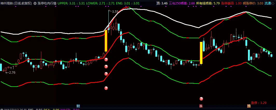 当三轨呈现红色多头排列,且K线以"红黄叠色"突破上轨时——