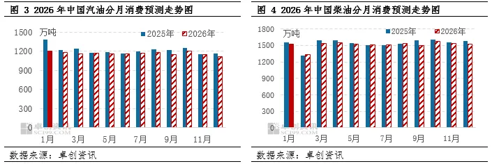 综合考虑下,预计2026年中国汽、柴油消费量或同比继续下滑,但汽油消费量降幅或同比收窄。预计2026年汽油消费量或在1.4亿吨左右,同比下降4.13%;柴油消费量或在1.82亿吨左右,同比下降1.63%。分月来看,春节、国庆长假和暑假自驾出行范围扩大,对汽油消费带来支撑;柴油方面,天气和气温对户外施工影响较大,物流仓储邮政用油主要受电商促销节影响,因此3-5月以及10-11月柴油消费量普遍回升,但是整体回升空间逐步收窄。